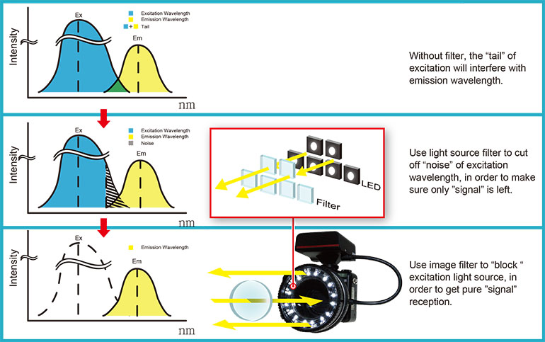 - Light source filter: When peak excitation wavelength is very close to peak emission wavelength, it is necessary to cut off excitation light spectrum to avoid interference of the unwanted fluorescent signals. Often the intensity of excitation light source is much stronger than emission signals.