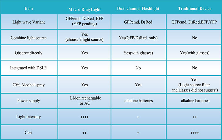 Reporter genes are widely used in current animal models in research and analysis. Among the reporter genes, fluorescent proteins are most commonly used due to their availability, stability and diverse color of choice. However, observation and data keeping often become a difficult task due to the pricy equipment, suboptimal photographic quality, and the lack of flexibility for imaging of different fluorescent wavelengths. Not to mention the difficulties in simultaneously observation object with multiple fluorescent wavelengths.